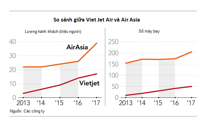 Hiện tại, giá trị thị trường của VJC là 3,6 tỉ USD so với con số 2,5 tỉ USD của Air Asia. Tuy nhiên, công ty Malaysia thống trị về số tàu bay với 208 chiếc và sẽ thêm 375 chiếc nữa.