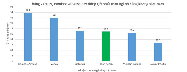 Theo báo cáo của Cục Hàng không Việt Nam, Bamboo Airways là hãng hàng không bay đúng giờ nhất toàn ngành tháng 7/2019 với tỷ lệ bay đúng giờ (OTP) là 93,8%.