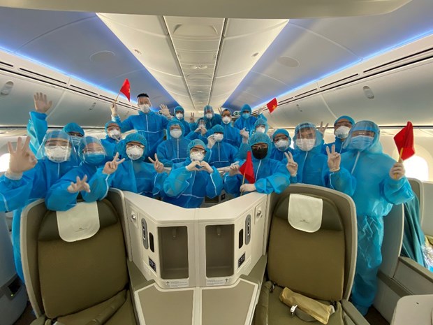 Toàn bộ phi hành đoàn Vietnam Airlines phải mặc quần áo bảo hộ toàn thân trong suốt quá trình phục vụ đưa người Việt Nam từ Mỹ về nước. (Ảnh: CTV/Vietnam+)