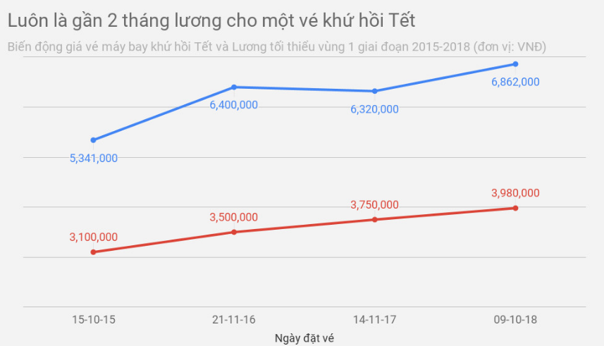 Dù lương tối thiểu vùng 1 những năm vừa qua đã liên tục được cải thiện, từ mức 3,1 triệu đồng vào năm 2015, lên 3,5 triệu đồng vào 2016, rồi 3,75 triệu đồng năm 2017 và gần nhất lên mức 3,98 triệu đồng vào năm 2018, việc mua chiếc vé máy bay để ra Bắc ăn Tết vẫn là xa vời với nhiều công nhân. Khoảng cách giữa thu nhập và vé luôn là gần 2 tháng lương tối thiểu mua một vé khứ hồi.