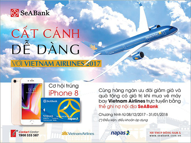 Từ ngày 08/12/2017 đến 31/01/2018, Ngân hàng TMCP Đông Nam Á (SeABank) phối hợp với Công ty Cổ phần Thanh toán Quốc gia Việt Nam (NAPAS) và Hãng Hàng không Quốc gia Việt Nam (Vietnam Airlines) chính thức triển khai chương trình khuyến mại “Cất cánh dễ dàng với Vietnam Airlines 2017”.
