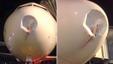 Vụ tai nạn hy hữu đã khiến phần đầu chiếc máy bay bị lõm sâu đường kính khá lớn, phần vỏ phía đầu của máy bay bị rách, đặc biệt là phần lõm vào của máy bay kèm theo rất nhiều vệt máu.