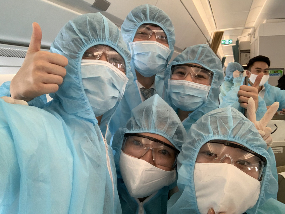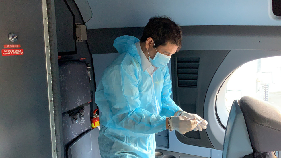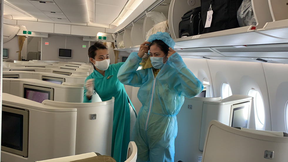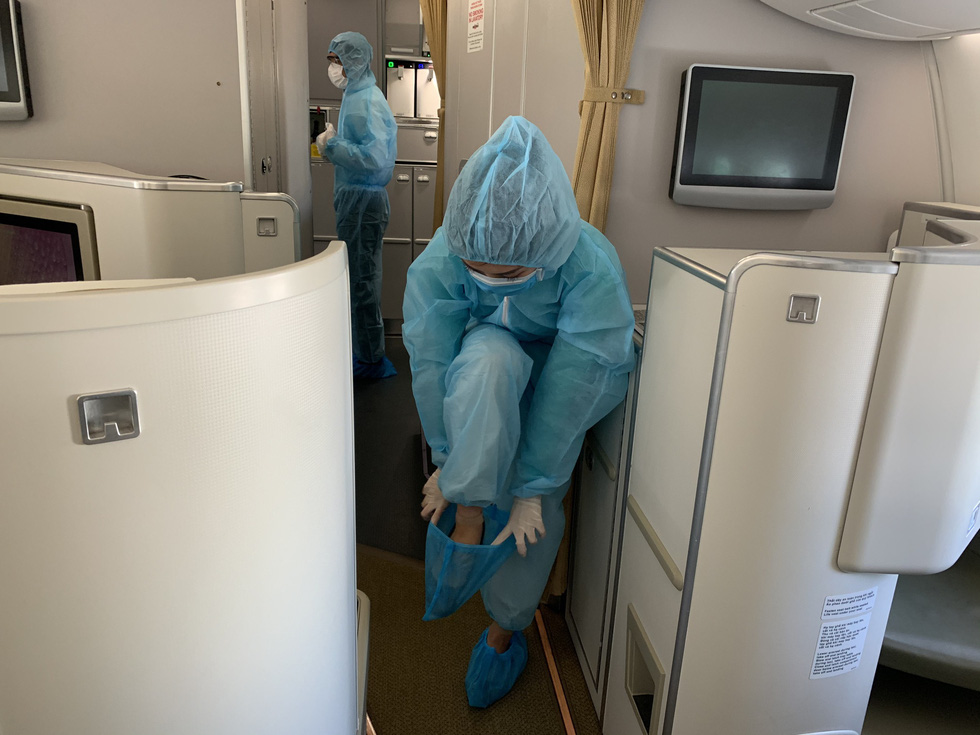 Trên mỗi chuyến bay, phi hành đoàn trang bị đồ bảo hộ y tế gồm áo mặc toàn thân – Ảnh: VNA