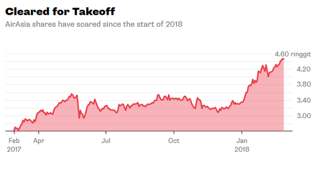 Hãng hàng không giá rẻ Air Asia đang bành trướng dữ dội ở Châu Á khi cổ phiếu của hãng này tăng mạnh hơn 33% kể từ đầu năm 2018.