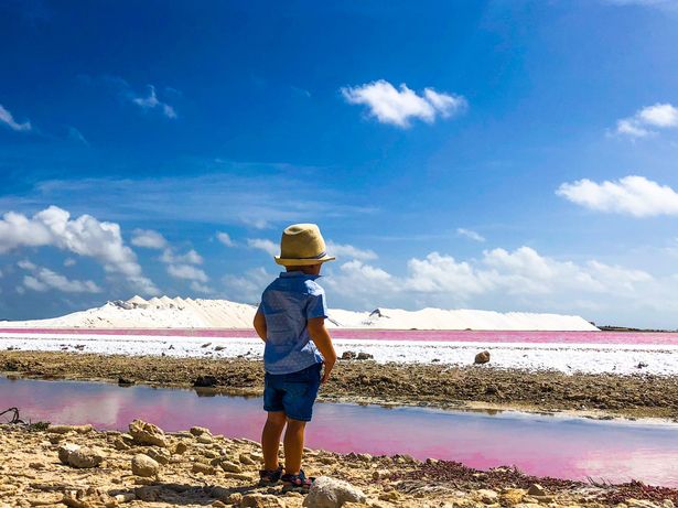 Trong hành trình Cậu bé 2 tuổi đứng trước hồ muối hồng ở Bonaire, Venezuela.