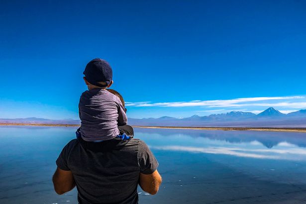 Eric được bố cõng trên vãi khi khám phá sa mạc Atacama ở Chile.
