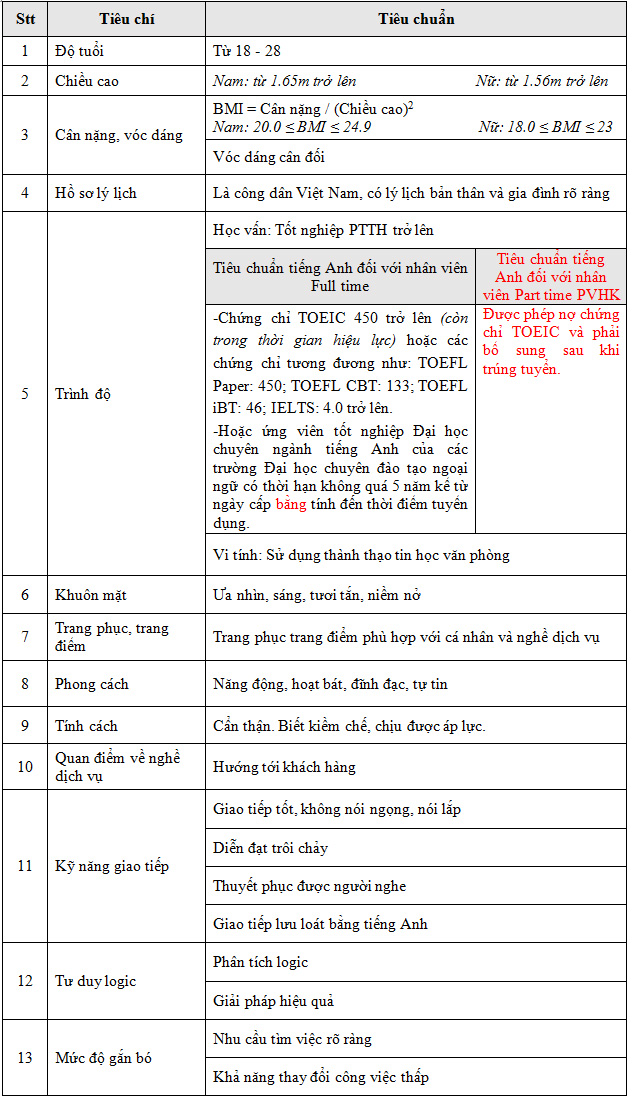 +Part time (Áp dụng một số vị trí chức danh nhân viên PVHK): Các ngày trong tuần kể cả ngày thứ 7, chủ nhật, ngày lễ, tết.