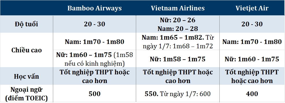 • Nữ chiều cao từ 1m60 – 1m75 (1m58 đối với những ứng viên đã từng là tiếp viên hàng không)