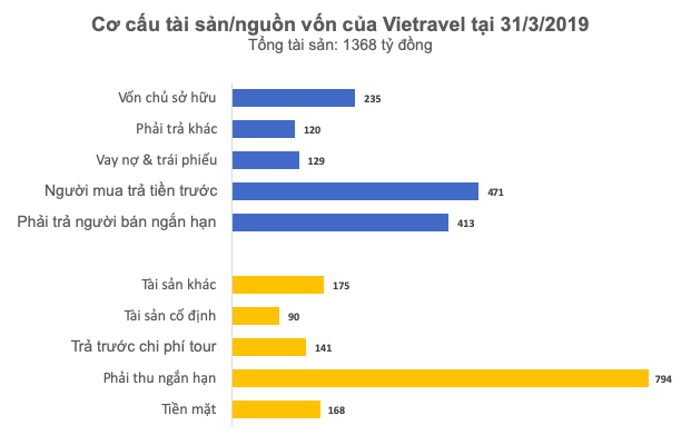 Tại thời điểm 31/3/2019, tổng tài sản và vốn chủ sở hữu của Vietravel chỉ đạt lần lượt là 1.368 tỷ và 235 tỷ đồng.