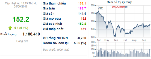 Trên thị trường, cổ phiếu VJC đang tăng tương đối tốt. Đặc biệt, 3 phiên trở lại đây (24-26/9) thanh khoản cổ phiếu khá mạnh, mỗi phiên ghi nhận hơn 1 triệu đơn vị được giao dịch. Chốt phiên 26/9, VJC dừng tại mức 152.200 đồng/cp.