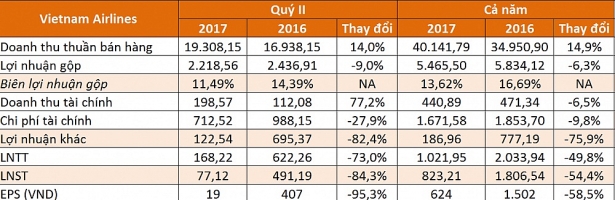 Lợi nhuận trước thuế của Vietnam Airlines đạt 77 tỷ đồng trong quý II và 823 tỷ đồng lũy kế 6 tháng đầu năm, con số này cao hơn số công bố trước đó bởi trong cuộc họp với Bộ Giao thông Vận Tải, ước lợi nhuận quý 2 của Vietnam Airlines lỗ 23 tỷ đồng. EPS riêng quý II chỉ đạt 19 đồng/cp. So với kế hoạch 1.638 tỷ đồng đề ra đầu năm, Vietnam Airlines hiện đã hoàn thành 50,2%.